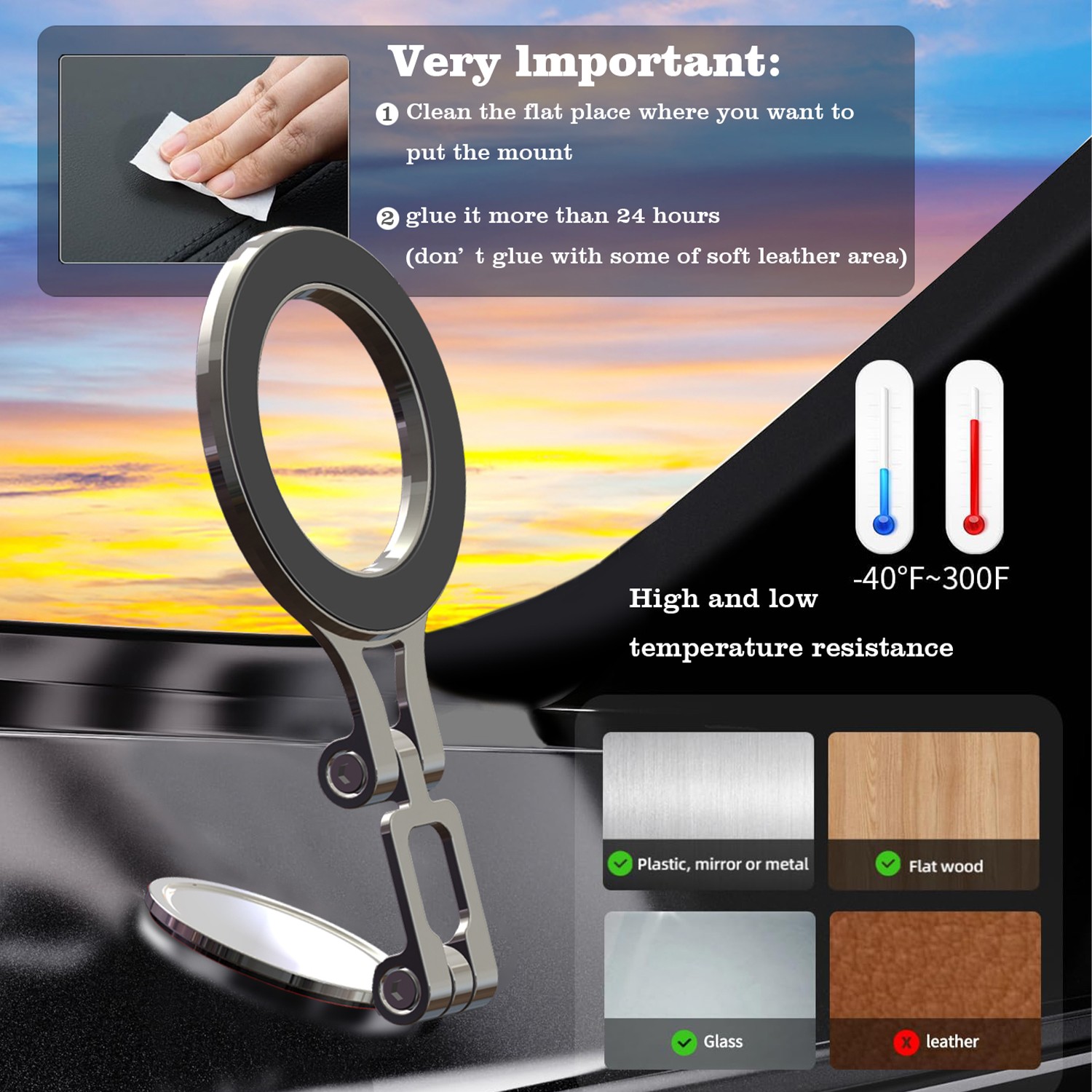 -Premium 3M Adhesive: It uses authentic 3M GPH-160 adhesive for enhanced stability. Even in extreme temperatures ranging from -40 F to +300 F, the magnetic car mount maintains adhesion, offering long-lasting stability, and includes spare adhesive pads for replacement. Press for 10 seconds and wait for 5 hours to strengthen adhesion. (IMPORTANT NOTICE: 3M adhesive tape is not suitable for application on interior surfaces like genuine leather, suede, and oil-coated fabrics. Avoid using it on these surfaces to prevent damage or poor adhesion.)